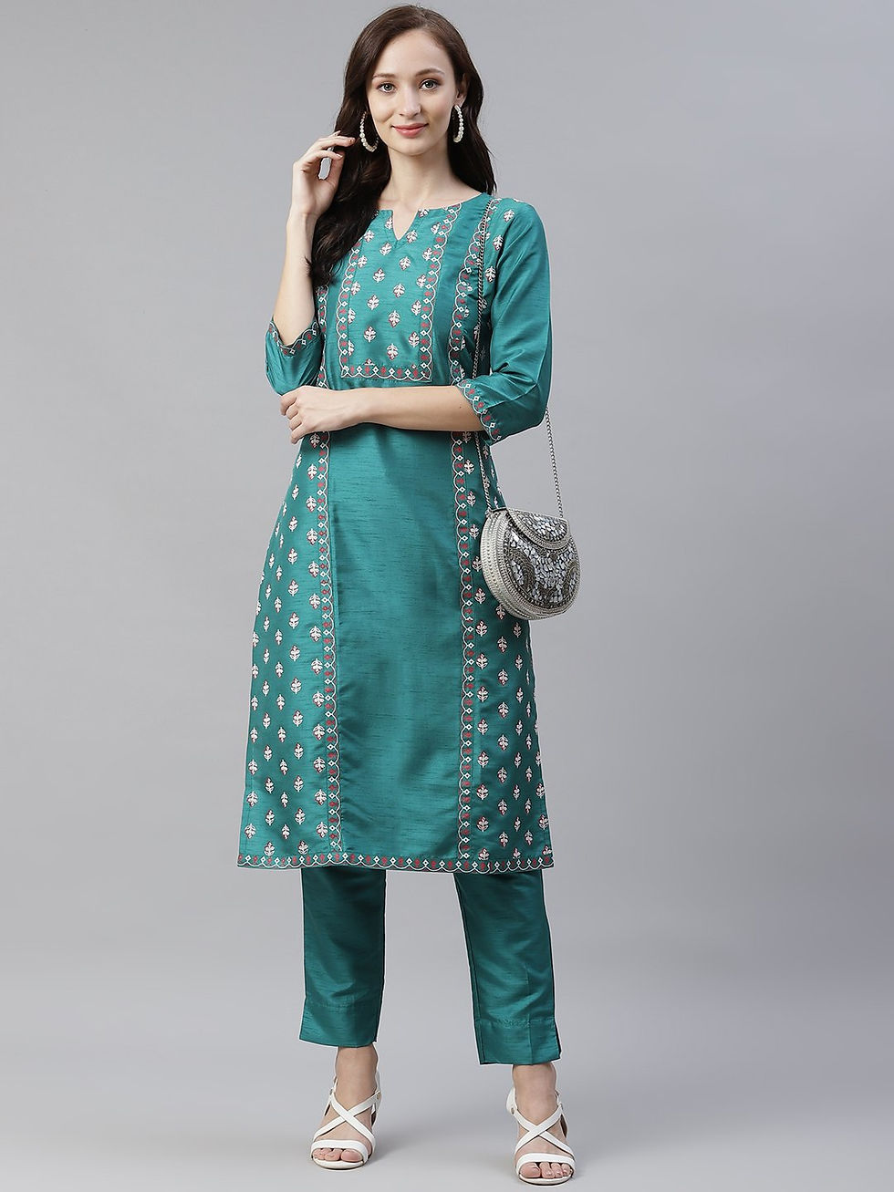 Women's Teal Color Foil Print Straight Kurta And Pant Set
