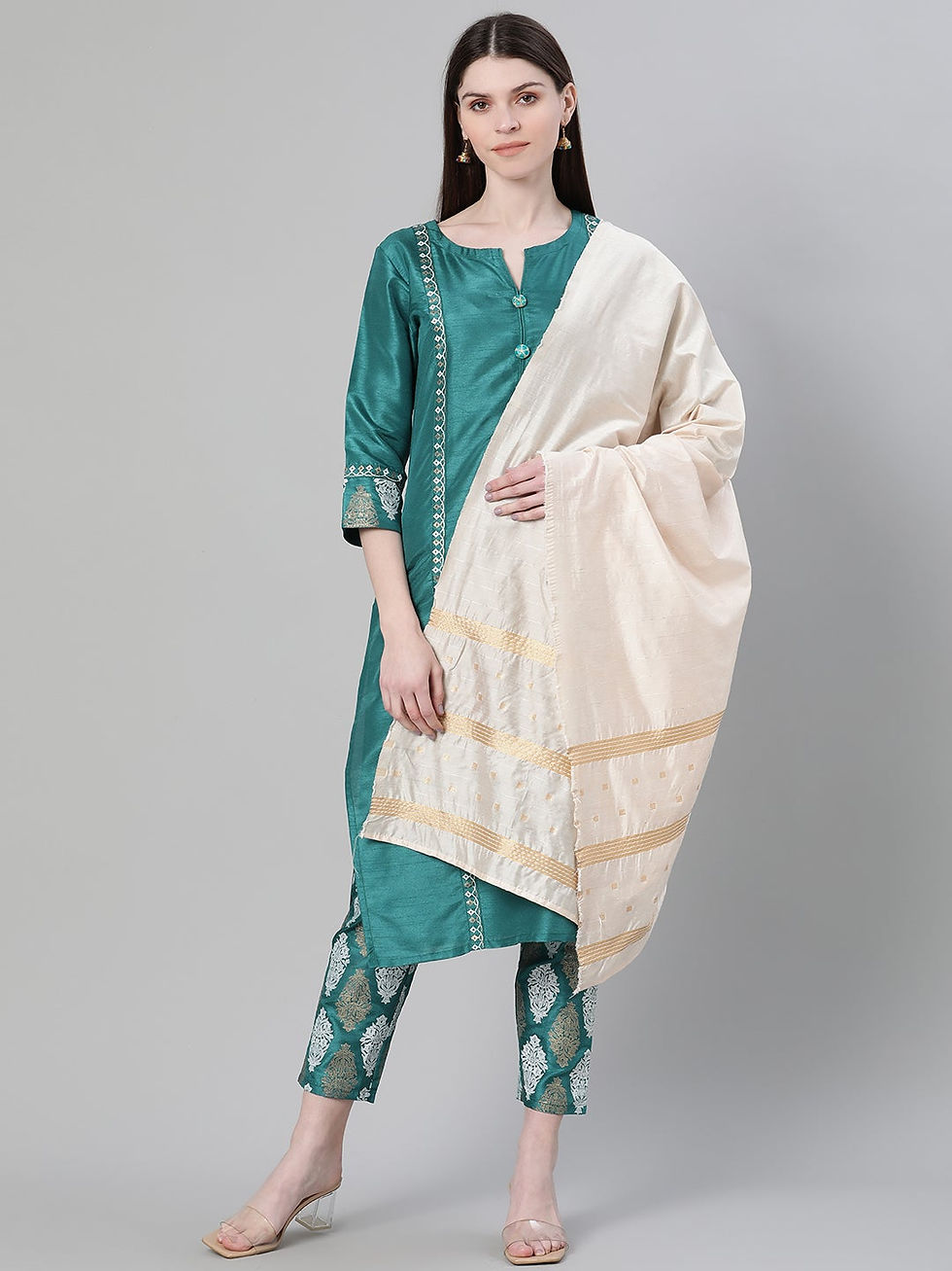 Green Color Foil Print Straight Kurta Pant And Dupatta Set
